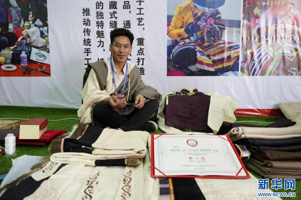 8月9日,在那曲市“乡村振兴 那曲奋进”活动成果展上,获奖者多杰展示自己的作品和获奖证书。新华网发 朱俊 摄