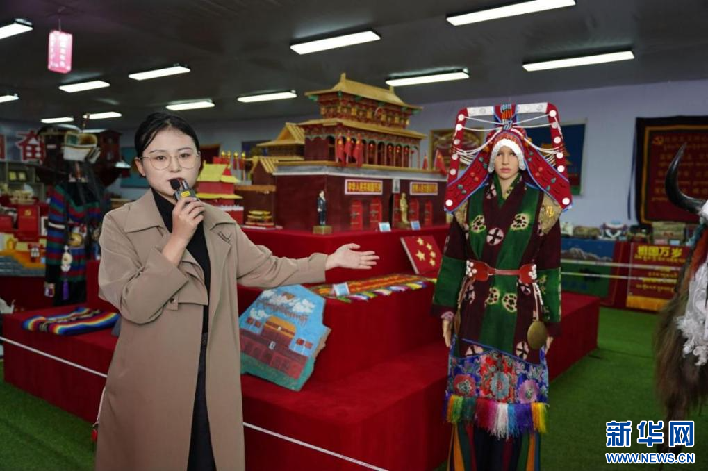 8月9日,那曲市“乡村振兴 那曲奋进”活动成果展上,工作人员正在介绍参展服饰。新华网发 朱俊 摄