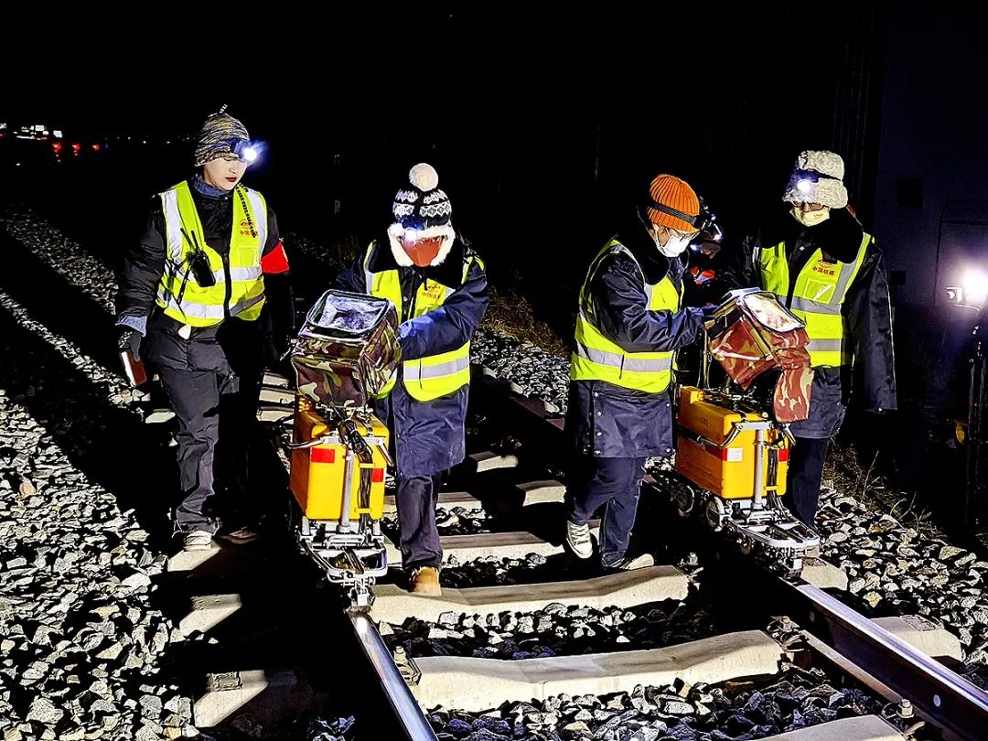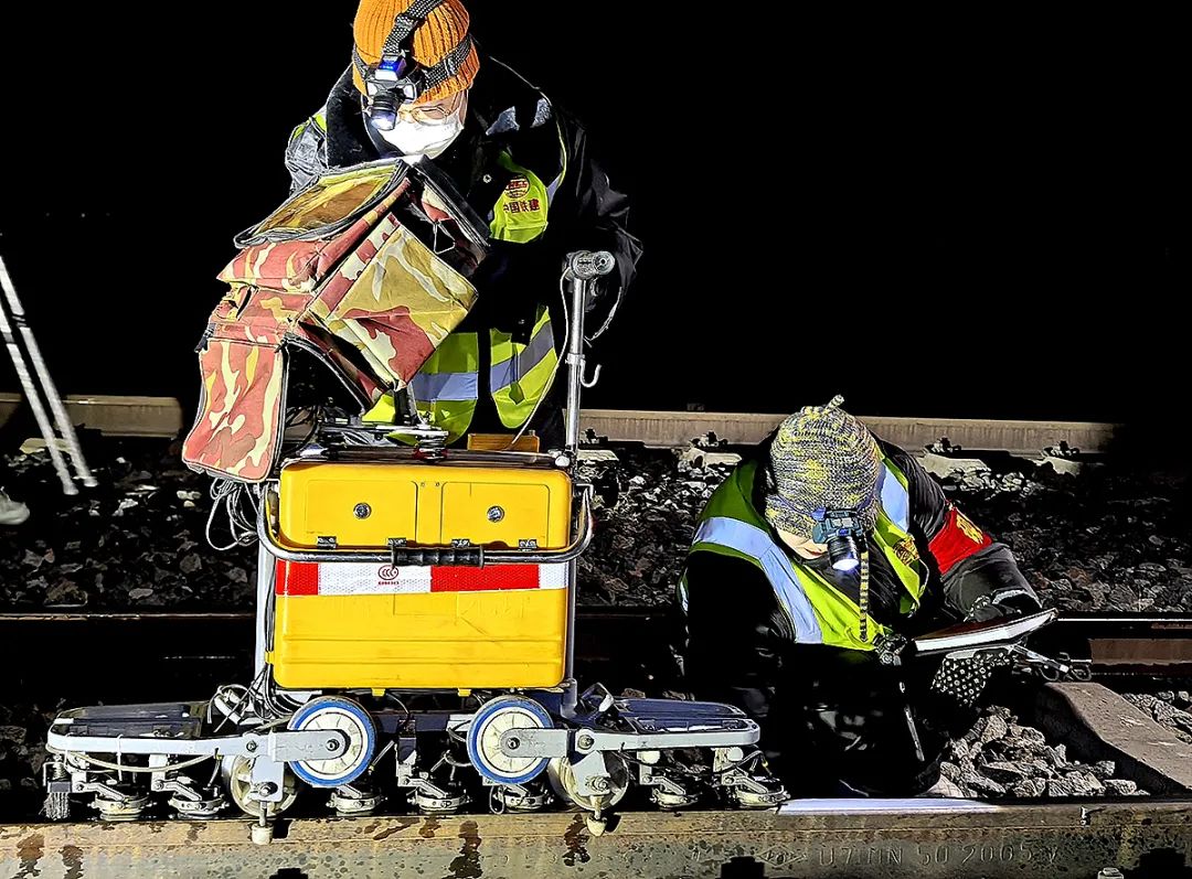 随后,她们手持探伤仪器,沿着铁轨一路前行。尽管气温极低,夜色如墨,只有远处偶尔闪烁的信号灯,在黑暗中划出微弱的光弧。但她们却未有丝毫懈怠,因为任何微小的波动都可能意味着铁轨存在潜在的问题。姐妹们分工明确、配合默契,操作设备的队员专注于仪器屏幕,不放过任何异常信号,记录数据的队员迅速记录着回传数据信息。遇到信号异常时,她们立刻停下,用手电筒照亮轨道,弯下身来反复细致地检查每一寸铁轨的状况,不放过任何微小的细节。