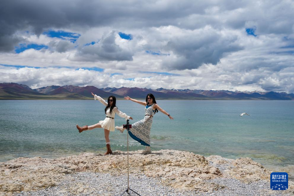 7月16日,两名游客在纳木错湖边自拍。新华社记者 晋美多吉 摄