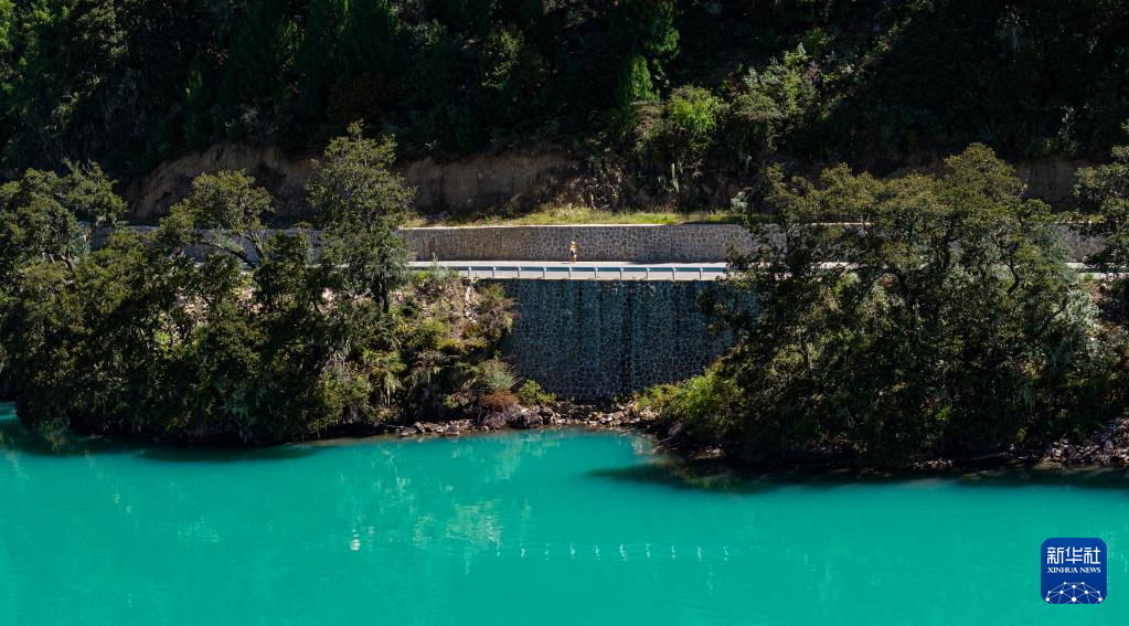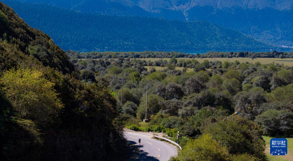 9月27日,参赛选手穿过巴松措湿地(无人机照片)。新华社记者 普布次仁 摄