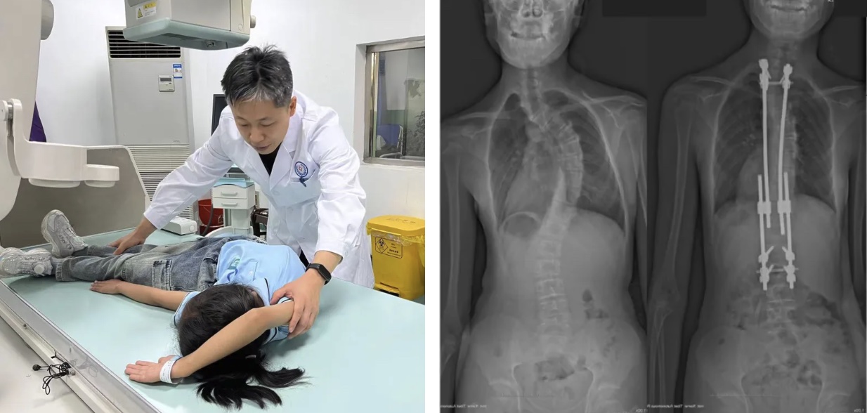 ▲左:蔡思逸帮助脊柱畸形儿童拍摄特殊体位X线片,评估脊柱柔韧性;右:蔡思逸完成西藏第一例早发型脊柱侧凸双生长棒矫形手术,效果良好