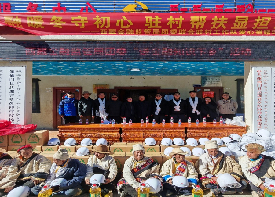 11月14日,西藏日喀则市彭冲村驻村工作队联合西藏金融监管局团委,在彭冲村村委会广场举办“金融暖冬”爱心捐赠活动,为该村140户村民发放安全头盔和食用油等物资。
