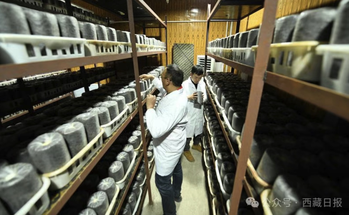 图为山南市乃东区索珠村藏药材种植基地内工作人员正在检查菌包。记者 唐斌 摄