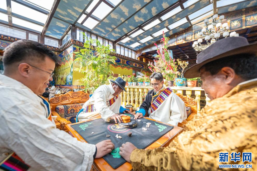 1月20日,西藏日喀则市桑珠孜区聂日雄乡楚松村村民多吉旺堆(左二)和家人在玩骰子。新华网 旦增努布 摄