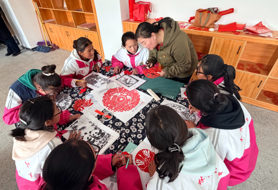 西藏日喀则市南木林县第二中学教师崔现英给学生教剪纸技艺。新华网发 强巴欧珠 摄