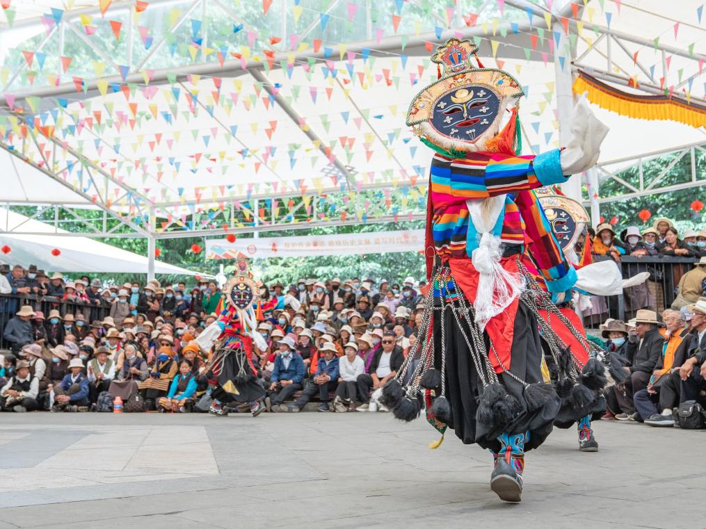 夜幕降临,藏戏的鼓点和唱腔又回荡在扎西曲登社区。
